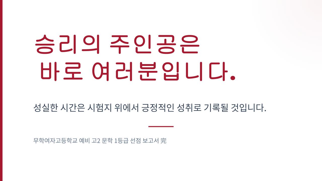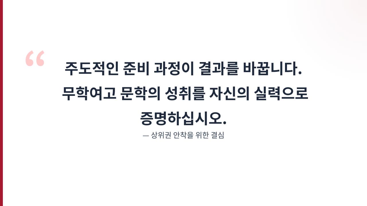 하지만 무학여고의 평가 성향을 이해하고 통합적인 로드맵에 따라 대비한다면 상황은 분명 달라질 거예요. 3월 첫 시험에서 목표로 하는 성적을 확인하며 보람을 느끼는 순간이 여러분의 모습이 될 수 있습니다. 주도적인 준비 과정이 결과를 바꿀 수 있다는 점을 기억해 주세요. 무학여고 문학의 성취를 자신의 실력으로 증명할 수 있도록 이 보고서가 응원하겠습니다. 자신감 있게 시작해 보세요.