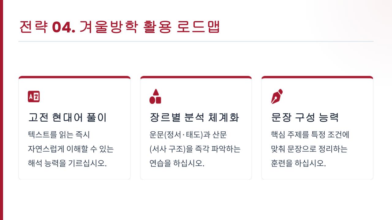 이번 겨울방학 동안 들인 여러분의 정성은 반드시 만족스러운 결과로 나타날 거예요. 자신을 믿고 이 보고서의 제안들을 활용하며 차분하게 나아가 보세요. 텍스트를 분석하고 원리를 이해하며 고민했던 성실한 시간들은, 3월 첫 시험지 위에서 긍정적인 성취로 기록될 것입니다.