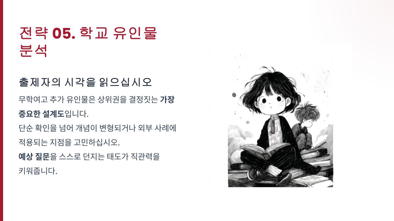 많은 학생이 유인물의 내용을 수동적으로 확인하는 수준에 그칠 때, 여러분은 그 이면에 담긴 의도를 파악하려 노력해 보면 어떨까요? 단순히 아는 단계를 넘어, 실제 시험 현장에서 신속하게 정보를 분석하고 대응할 수 있는 실전 기술을 갖추어 보세요. 이 기술을 체득한다면 실전에서 보다 확신을 가지고 문제를 해결하는 기쁨을 얻게 될 것입니다.