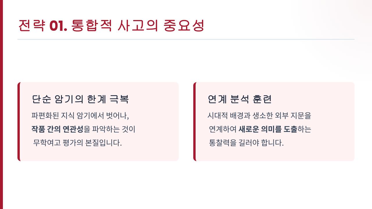 작품을 시대적 배경이나 생소한 외부 지문과 연계하여 새로운 의미를 도출해내는 통합적 사고력을 개학 전에 미리 길러두면 참 좋습니다. 다른 친구들이 줄거리를 외우는 데 집중할 때, 여러분은 여러 작품을 관통하는 핵심 주제를 찾아내는 훈련을 시작해 보세요. 이러한 통찰력이 갖춰진다면 실제 시험장에서 보다 정확하고 신속하게 정답을 찾아내는 실질적인 힘을 얻게 될 것입니다.