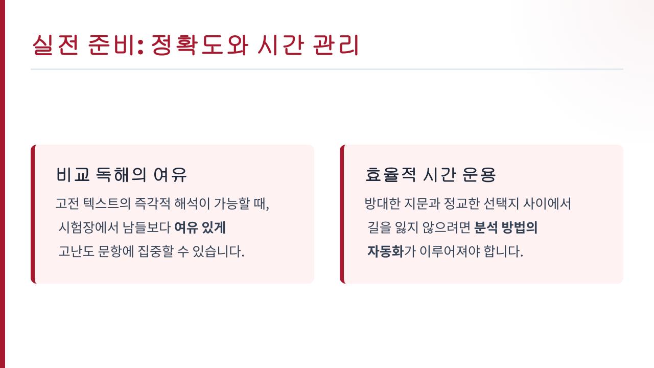 다른 학생들이 생소한 지문에 당황할 때, 여러분은 미리 준비한 분석 틀을 통해 정답의 근거를 차분하게 확인하는 여유를 갖게 될 거예요. 이것이 실제 성적 차이를 만드는 중요한 실전 역량이 될 수 있습니다.