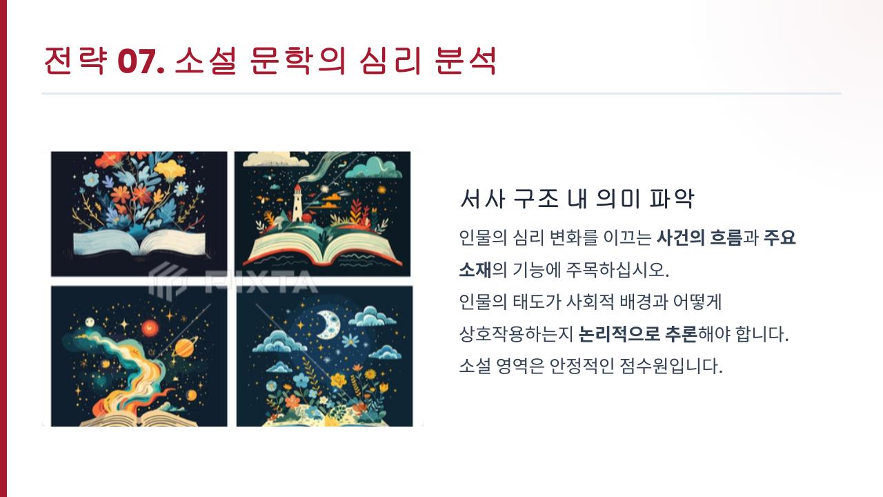 단순한 줄거리 파악을 넘어 각 장면에서 인물의 심리가 변화한 이유를 논리적으로 생각해보는 연습을 해보세요. 이 과정이 숙달된다면 소설 영역의 문항들은 여러분의 성적을 안정적으로 지탱해주는 든든한 점수원이 되어줄 것입니다.