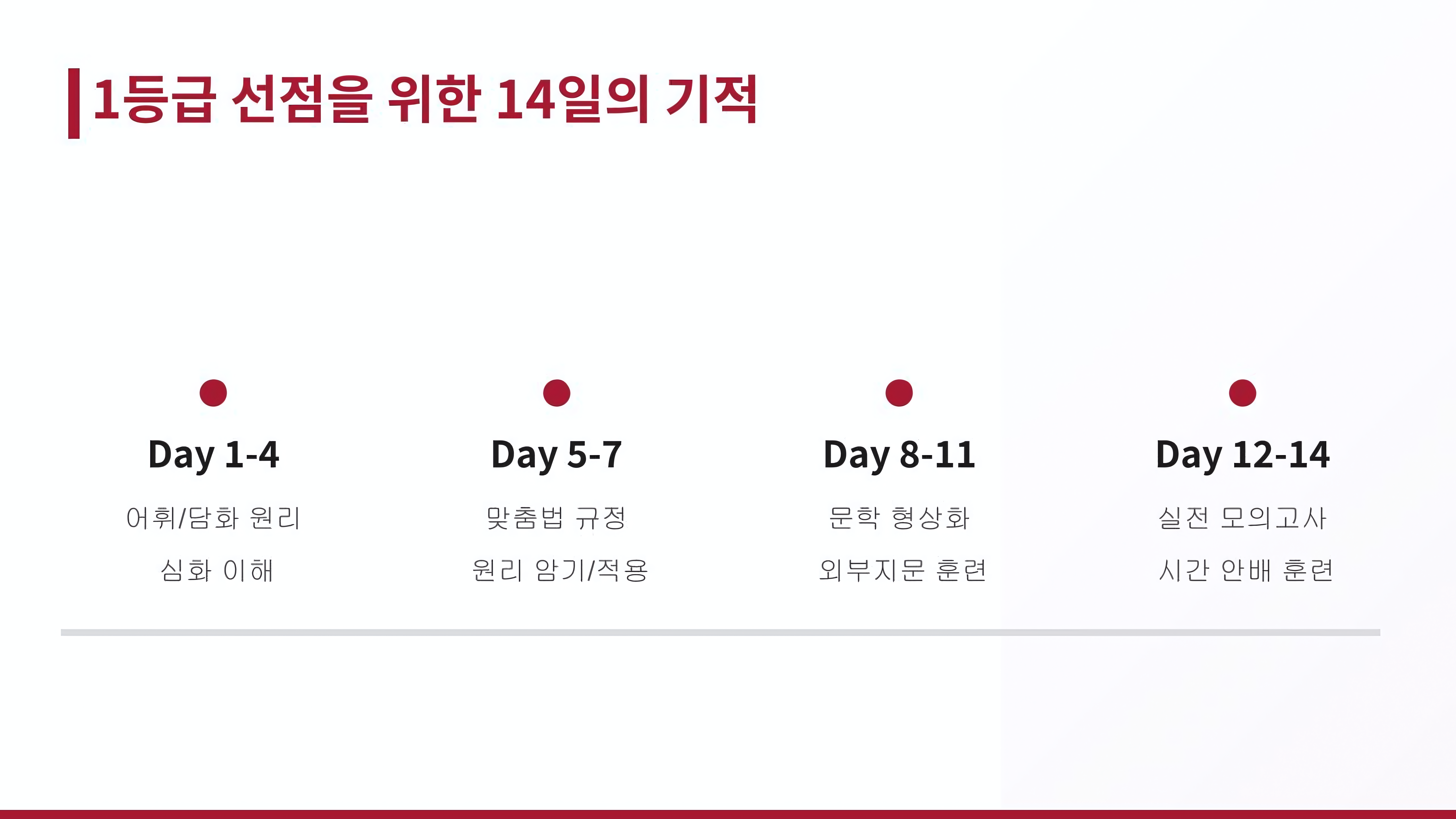 입학 전 마지막 14일은 그동안 학습한 내용을 체계화하고 실전 감각을 익히는 소중한 시간입니다.