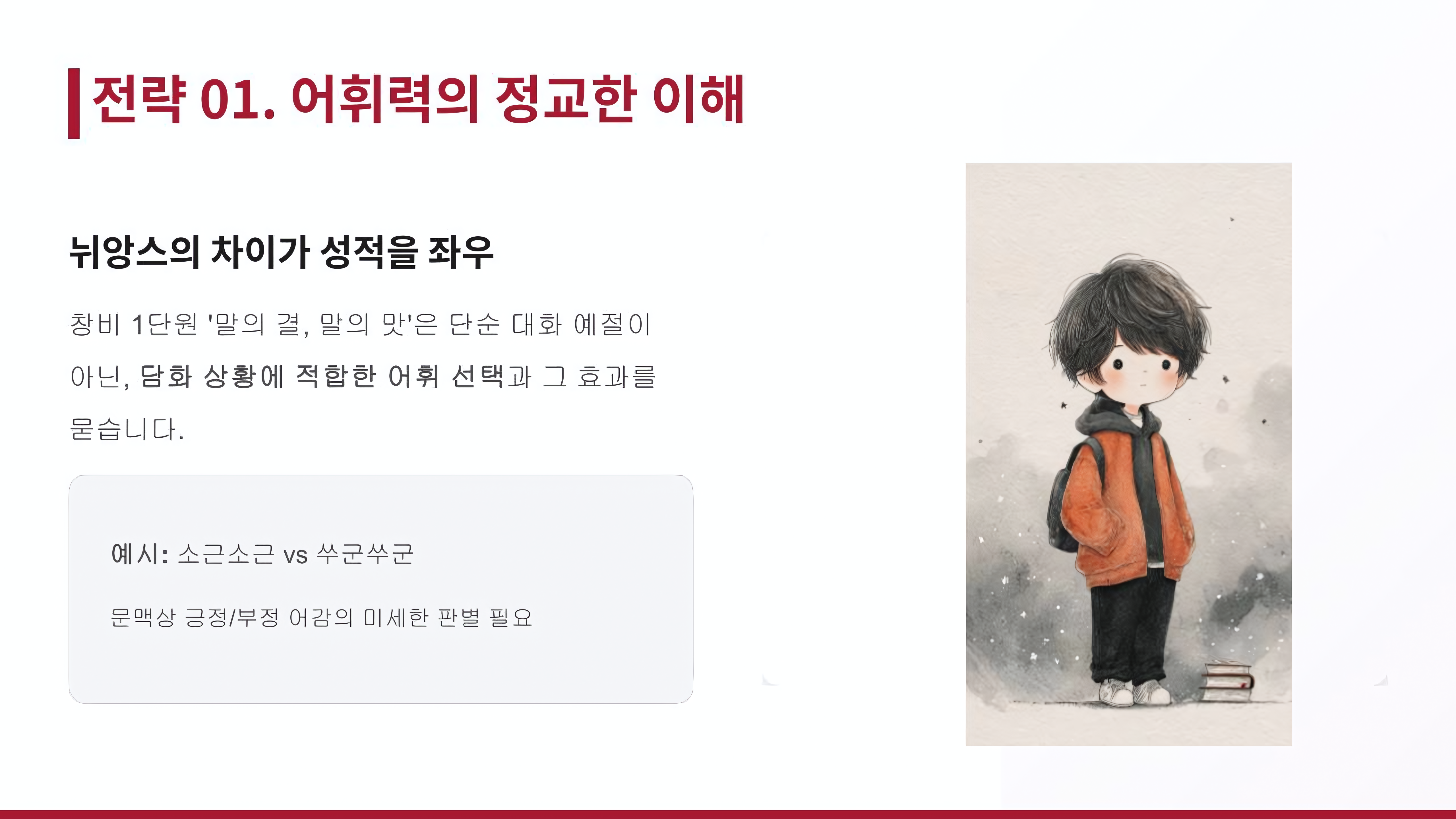 전략 01. 말의 결을 통한 어휘력의 정교한 이해 뉘앙스의 차이가 성적에 영향을 줄 수도 있습니다