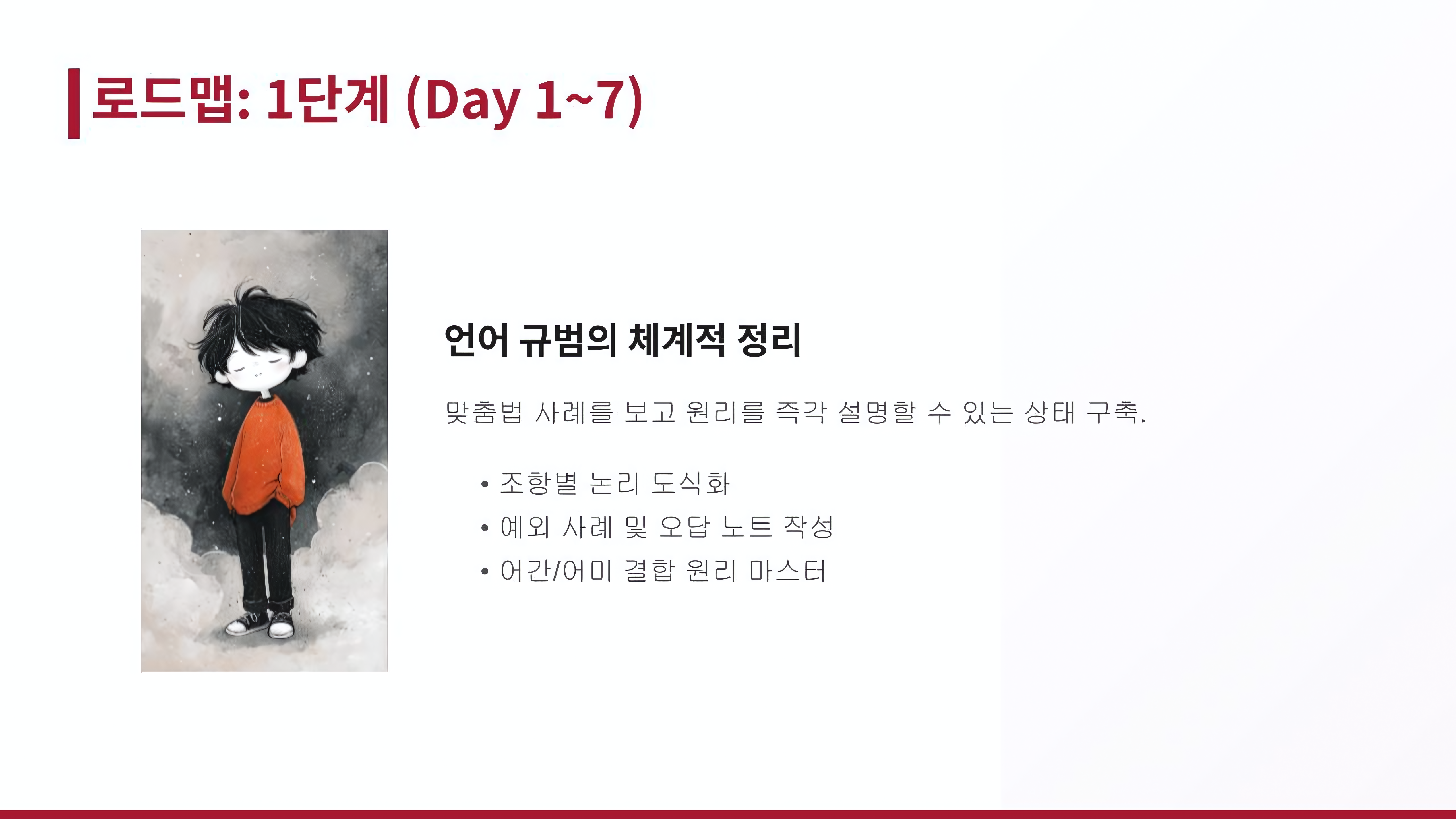 첫 7일 동안은 언어 규범의 체계적인 정리에 집중해 보세요. 맞춤법 사례를 접했을 때 그 원리를 논리적으로 설명할 수 있는 상태를 만드는 것이 좋습니다. 예를 들어 담가와 같은 사례를 보고 어간의 모음 탈락 원리를 즉각 연상할 수 있어야 합니다.