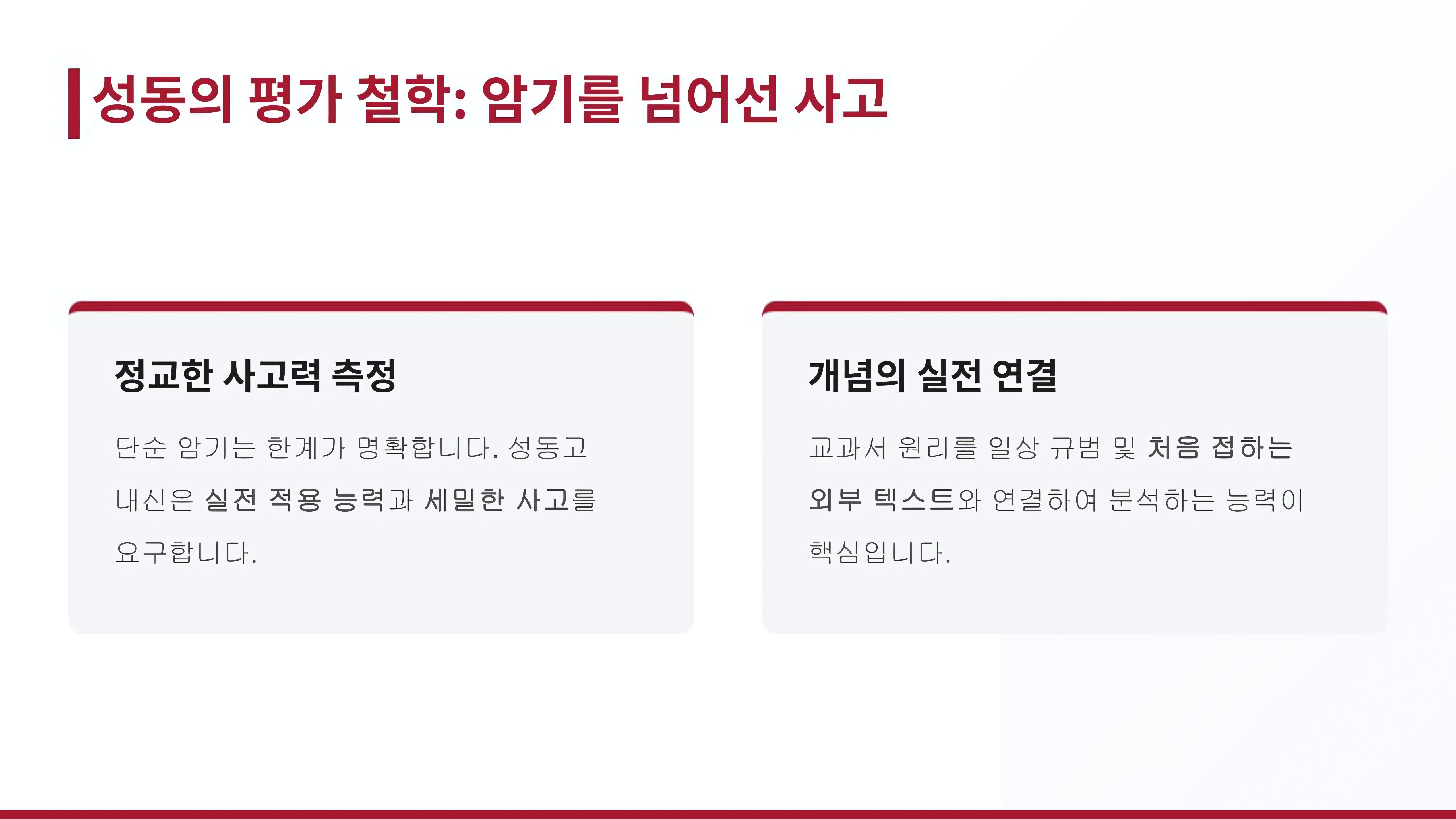단순히 교과서 내용을 암기하는 수동적인 태도에만 머문다면 실제 시험에서 마주할 생소한 어휘나 복합적인 규정 문제에서 조금 당황할 수도 있어요. 성동고는 변별력을 확보하기 위해 개념을 실전에 얼마나 잘 적용하는지를 중요하게 평가하곤 합니다.
