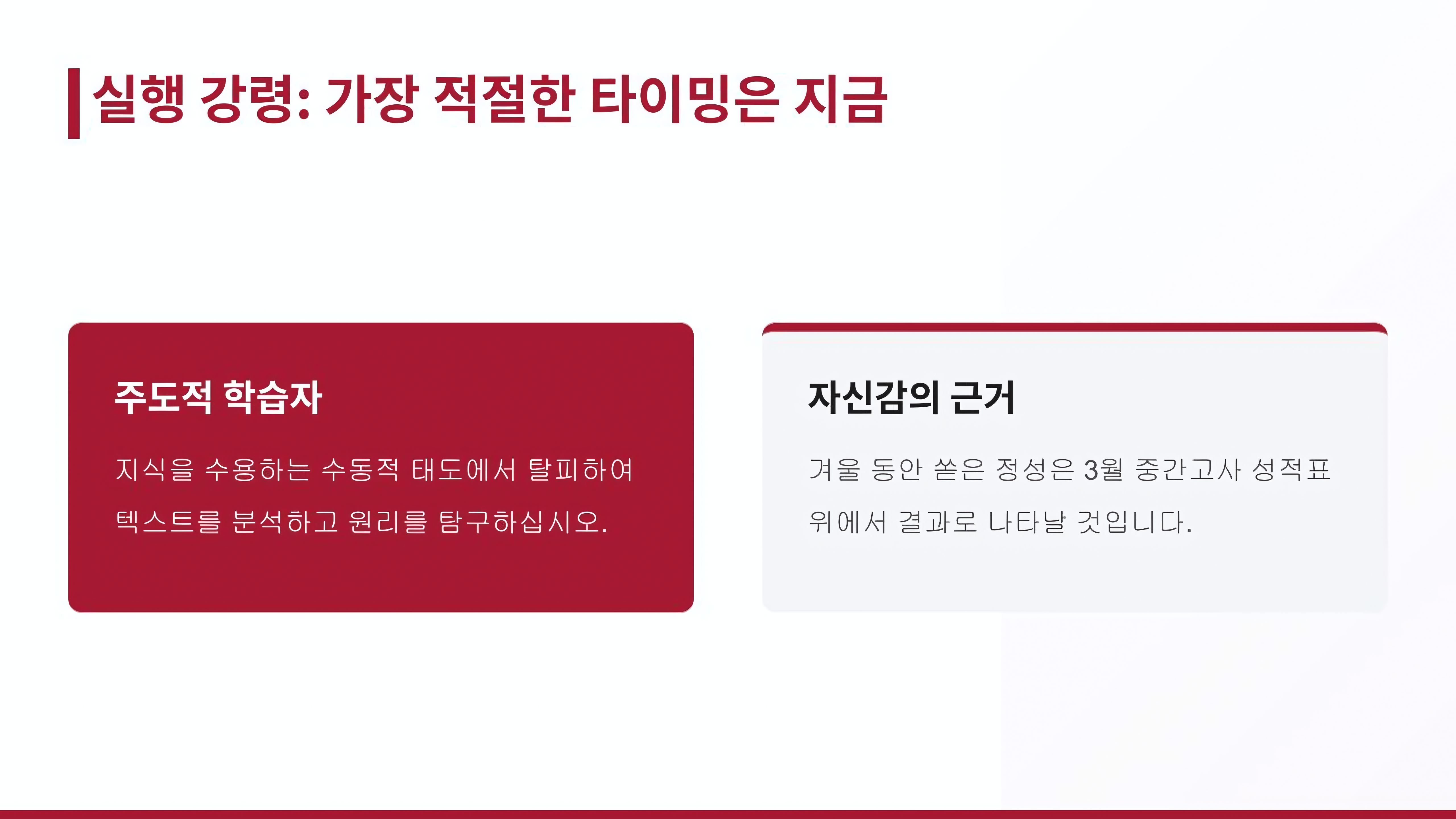 지금 이 전략들을 차근차근 행동으로 옮겨보세요. 이번 겨울 동안 쏟은 정성은 3월 첫 중간고사 성적표 위에서 만족스러운 결과로 나타날 수 있을 것입니다. 변화를 시작하기에 가장 적절한 타이밍은 바로 지금입니다. 자신감을 가지고 성동의 교정에서 목표한 성취를 이루는 주인공이 되시길 진심으로 응원합니다.