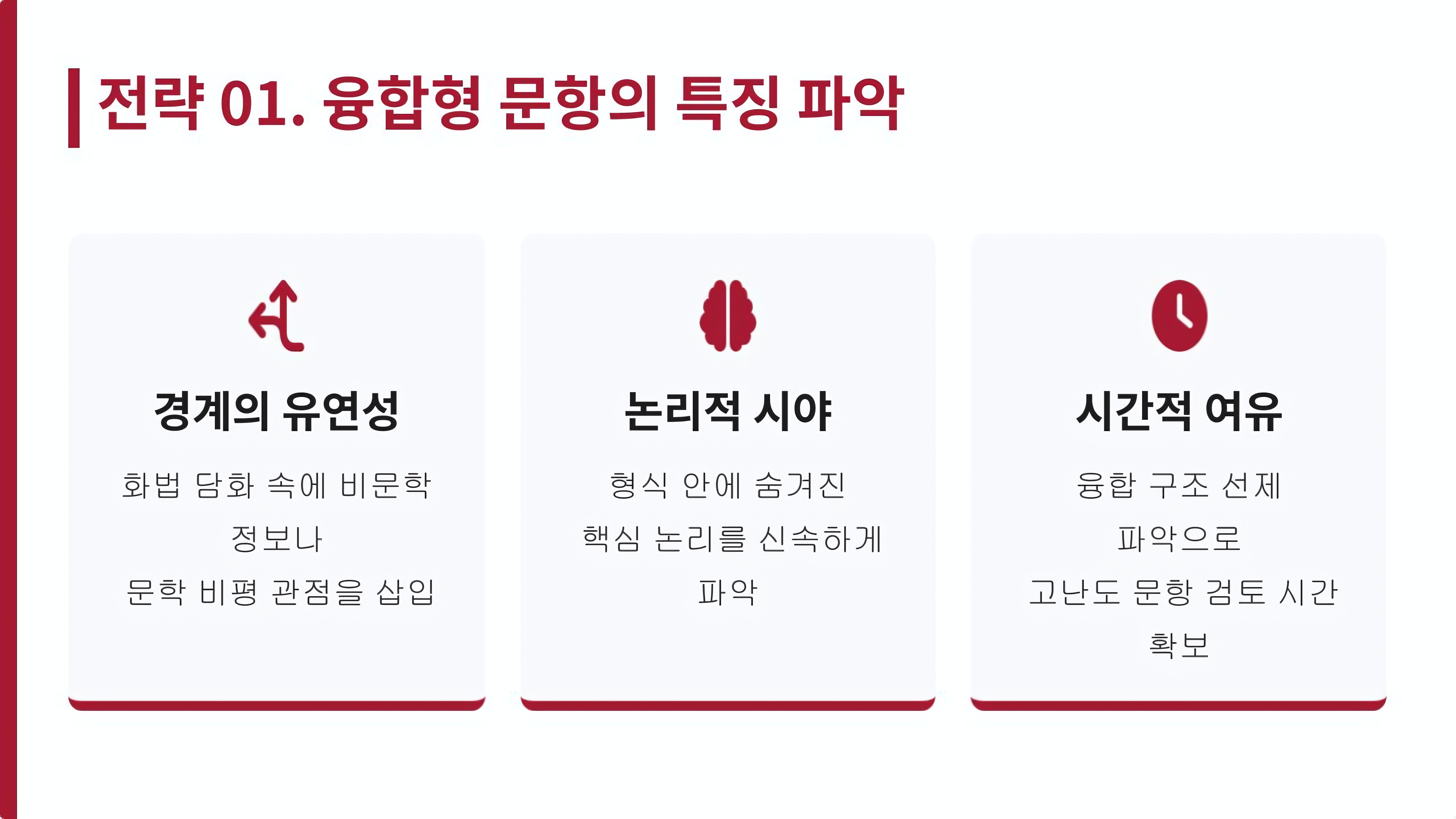 이러한 통합 지문의 구조를 선제적으로 파악해 보세요. 그러면 시험장에서 지문 성격이 변화할 때 느끼는 심리적 부담을 줄일 수 있습니다. 다른 학생들이 상황 파악에 시간을 보낼 때 여러분이 그 속에 담긴 핵심 논리를 신속하게 파악한다면, 복합 지문에서도 보다 여유 있게 정답을 찾아내는 긍정적인 변화를 경험하게 될 수도 있습니다. 3학년 시험에서 확보한 여유 시간은 배점이 높은 어려운 문항들을 차분하게 해결하는 데 큰 도움이 됩니다.