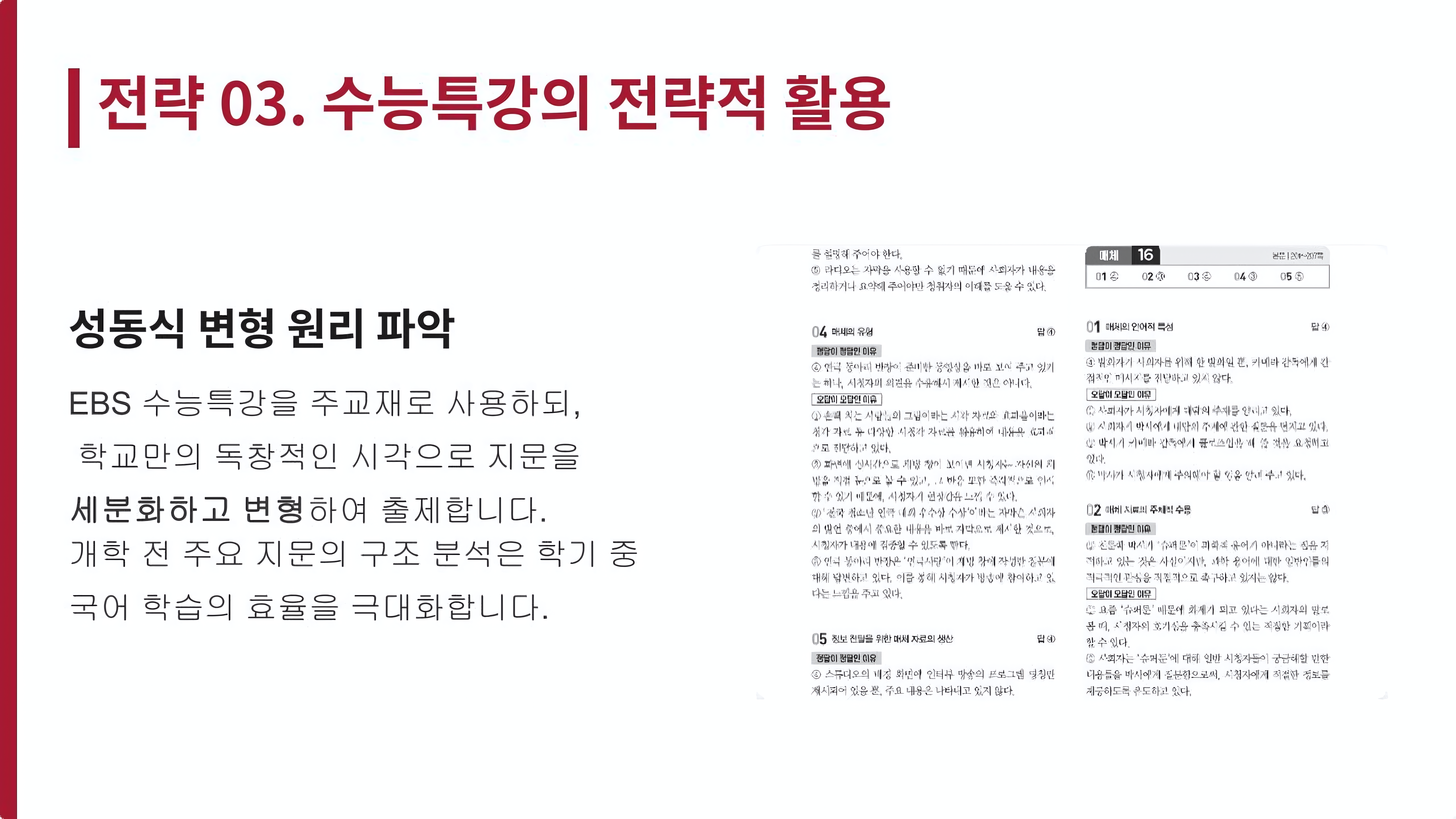 성동고 고3 내신은 EBS 수능특강을 주요 학습 자료로 활용하지만, 이를 그대로 출제하기보다는 학교만의 시각으로 재해석하여 변형하는 경향이 있습니다. 지문을 세분화하여 분석하고 독창적인 질문을 덧붙이는 방식입니다.