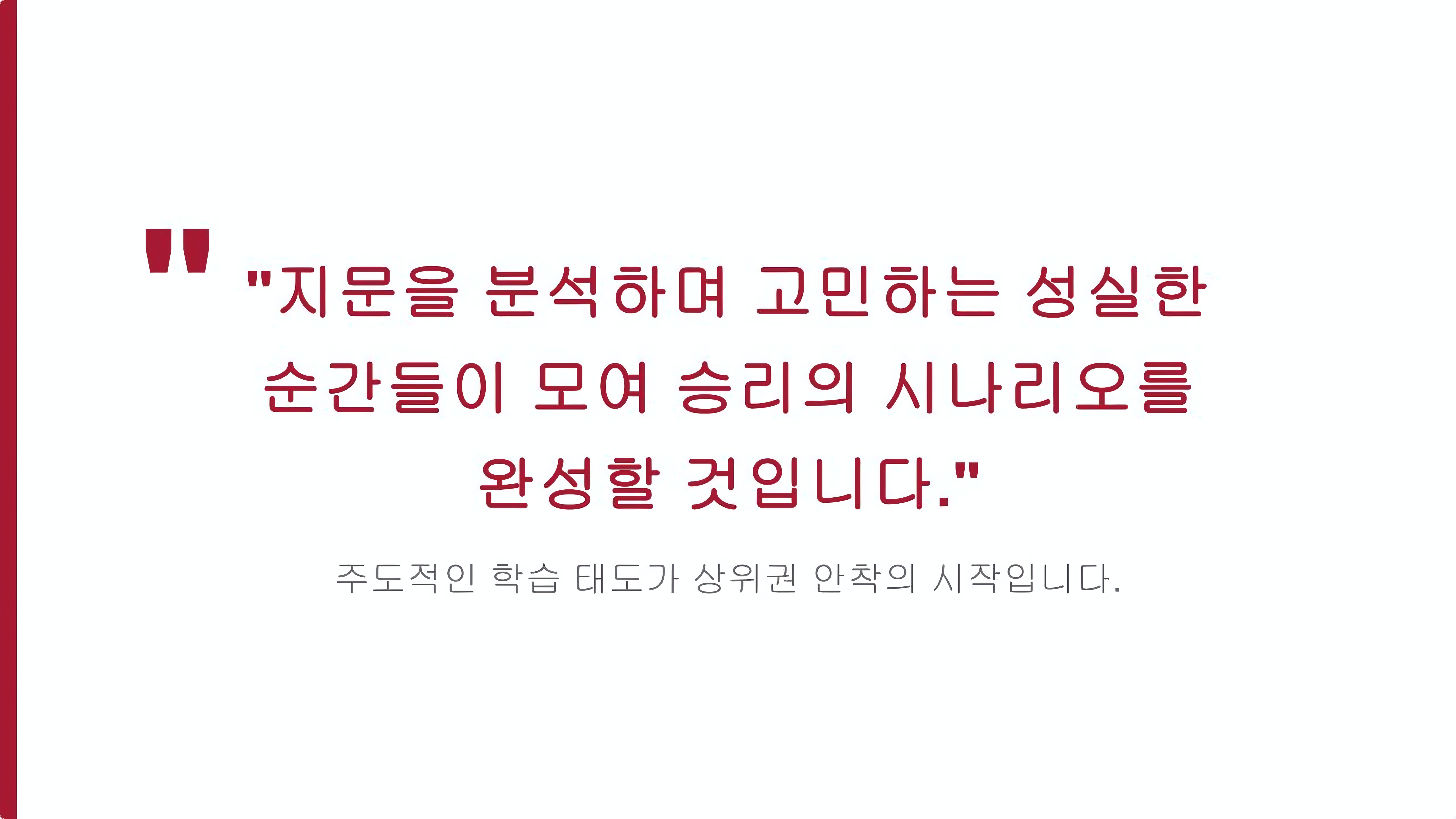 지금 이 시기에 진행하는 영역별 원리 이해와 분석 연습은 시험 당일 여러분의 실력으로 고스란히 나타날 것입니다. 파트 2에서 제안한 기술들은 여러분이 보다 체계적이고 주도적인 학습자로 성장하는 데 밑거름이 되어줄 거예요.