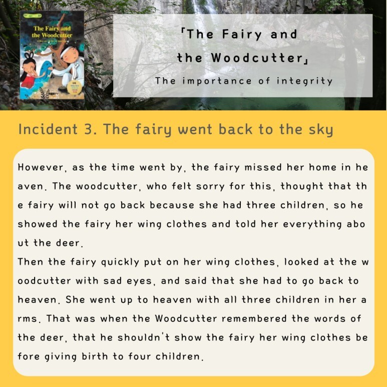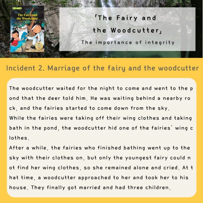 After a while, the fairies who finished bathing went up to the sky with their clothes on, but only the youngest fairy could not find her wing clothes, so she remained alone and cried. At that time, a woodcutter approached to her and took her to his house. They finally got married and had three children.