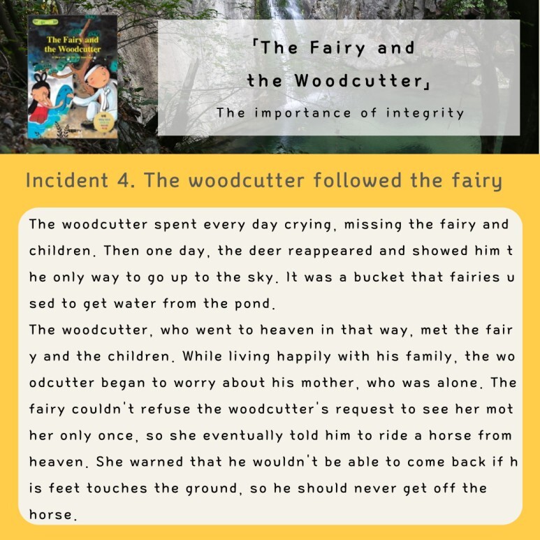 The woodcutter, who went to heaven in that way, met the fairy and the children. While living happily with his family, the woodcutter began to worry about his mother, who was alone. The fairy couldn't refuse the woodcutter's request to see her mother only once, so she eventually told him to ride a horse from heaven. She warned that he wouldn't be able to come back if his feet touches the ground, so he should never get off the