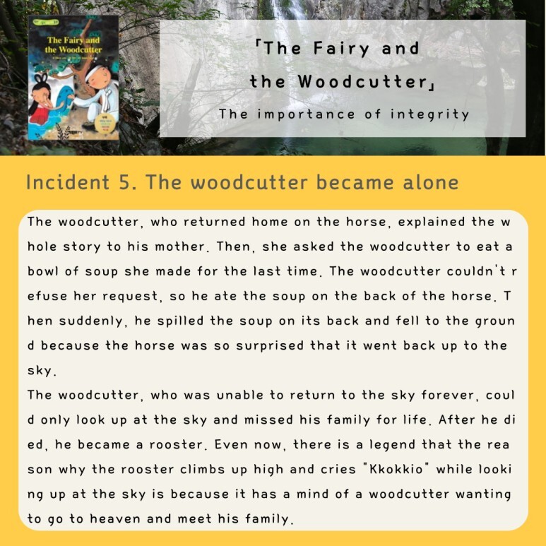 The woodcutter, who was unable to return to the sky forever, could only look up at the sky and missed his family for life. After he died, he became a rooster. Even now, there is a legend that the reason why the rooster climbs up high and cries "Kkokkio" while looking up at the sky is because it has a mind of a woodcutter wanting to go to heaven and meet his family.