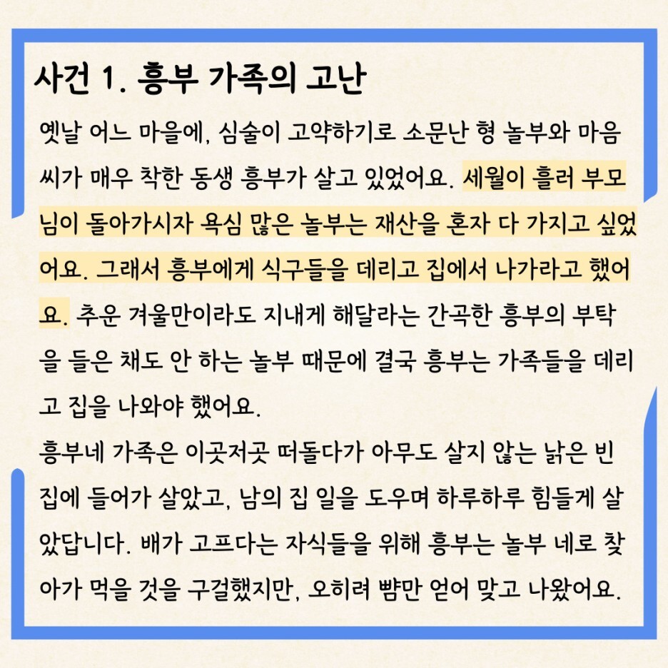 흥부네 가족은 이곳저곳 떠돌다가 아무도 살지 않는 낡은 빈 집에 들어가 살았고, 남의 집 일을 도우며 하루하루 힘들게 살았답니다. 배가 고프다는 자식들을 위해 흥부는 놀부 네로 찾아가 먹을 것을 구걸했지만, 오히려 뺨만 얻어 맞고 나왔어요.