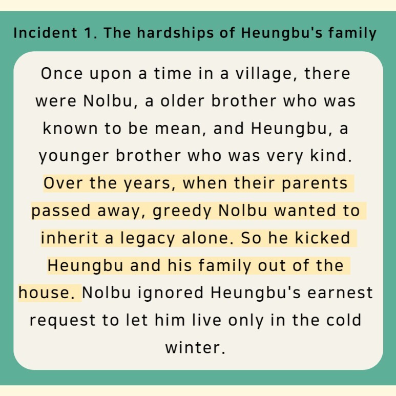Once upon a time in a village, there were Nolbu, a older brother who was known to be mean, and Heungbu, a younger brother who was very kind. Over the years, when their parents passed away, greedy Nolbu wanted to inherit a legacy alone. So he kicked Heungbu and his family out of the house. Nolbu ignored Heungbu's earnest request to let him live only in the cold winter.