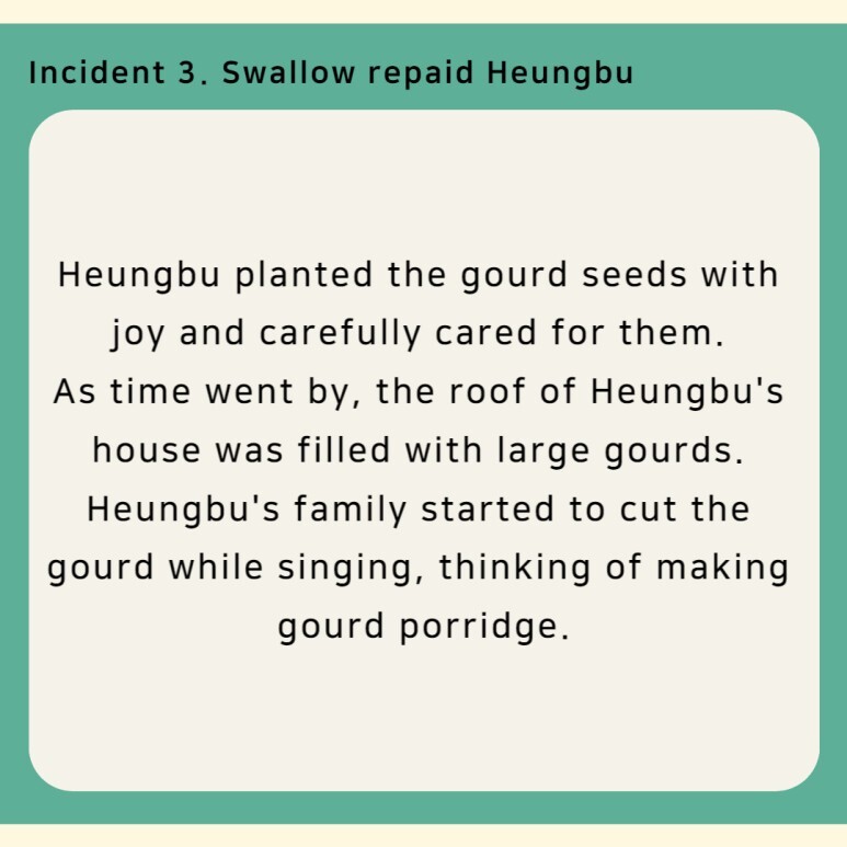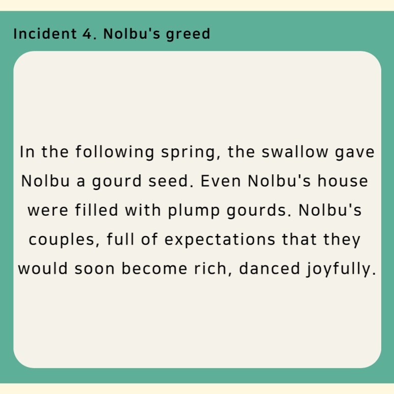 In the following spring, the swallow gave Nolbu a gourd seed. Even Nolbu's house were filled with plump gourds. Nolbu's couples, full of expectations that they would soon become rich, danced joyfully.