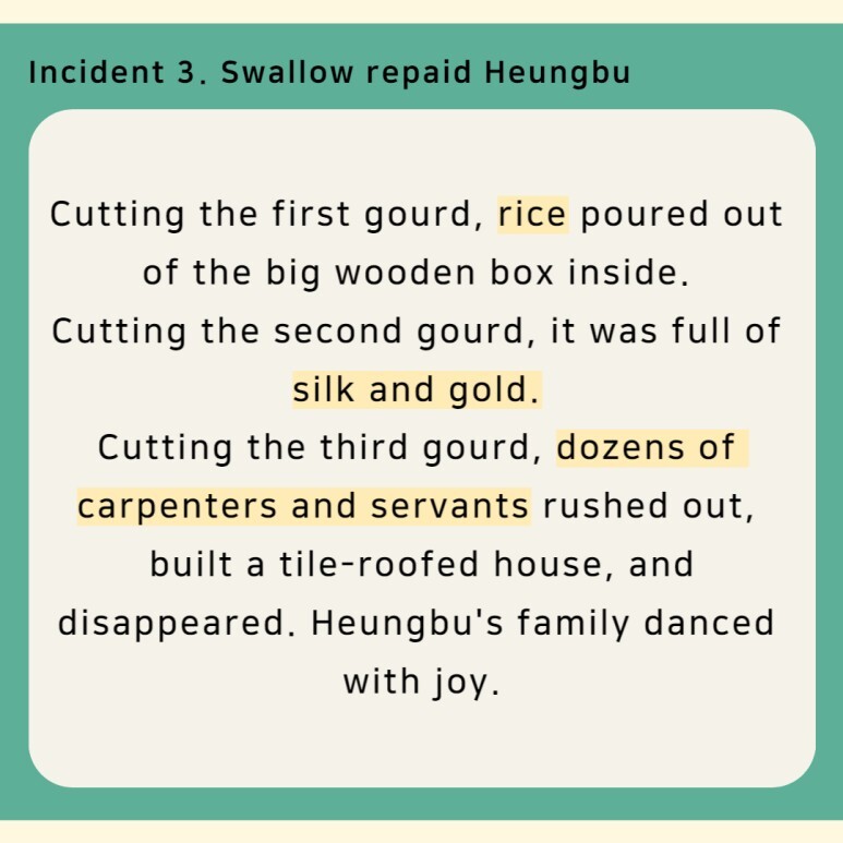 Cutting the first gourd, rice poured out of the big wooden box inside. Cutting the second gourd, it was full of silk and gold. Cutting the third gourd, dozens of carpenters and servants rushed out, built a tile-roofed house, and disappeared. Heungbu's family danced with joy.