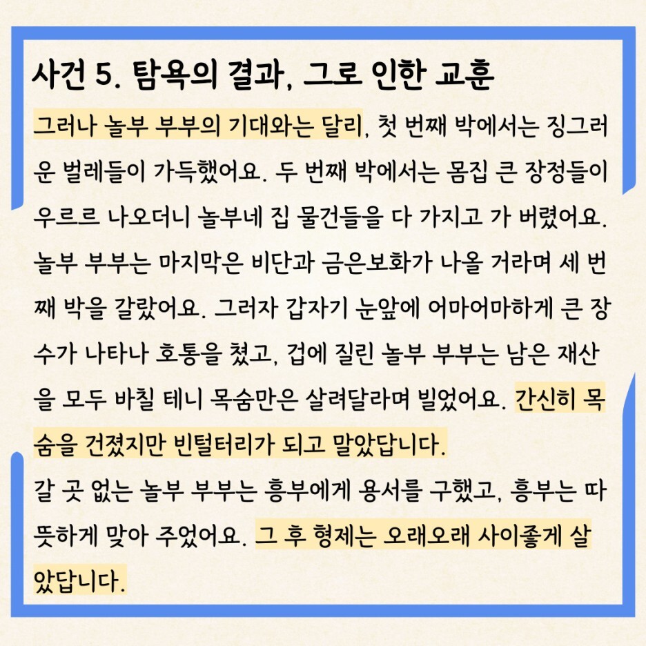 갈 곳 없는 놀부 부부는 흥부에게 용서를 구했고, 흥부는 따뜻하게 맞아 주었어요. 그 후 형제는 오래오래 사이좋게 살았답니다.