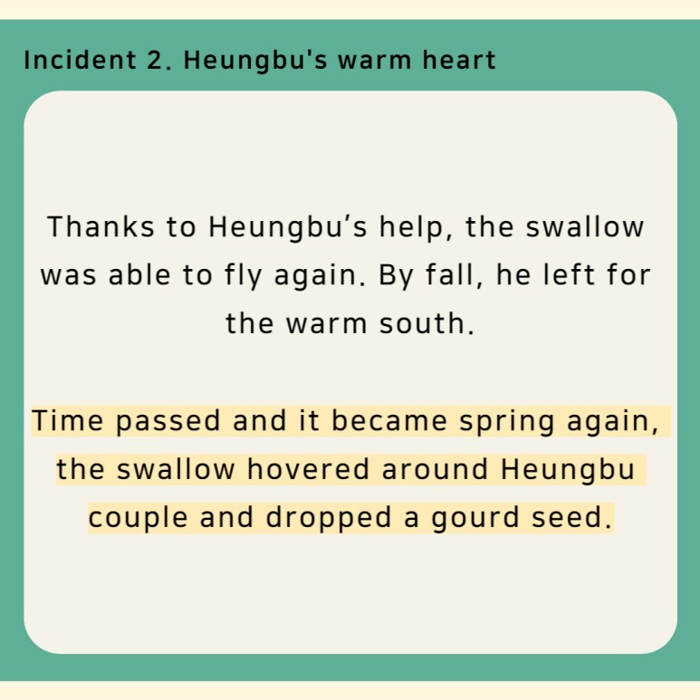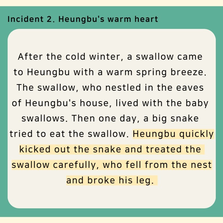 After the cold winter, a swallow came to Heungbu with a warm spring breeze. The swallow, who nestled in the eaves of Heungbu's house, lived with the baby swallows. Then one day, a big snake tried to eat the swallow. Heungbu quickly kicked out the snake and treated the swallow carefully, who fell from the nest and broke his leg. Thanks to Heungbu’s help, the swallow was able to fly again. By fall, he left for the warm south.