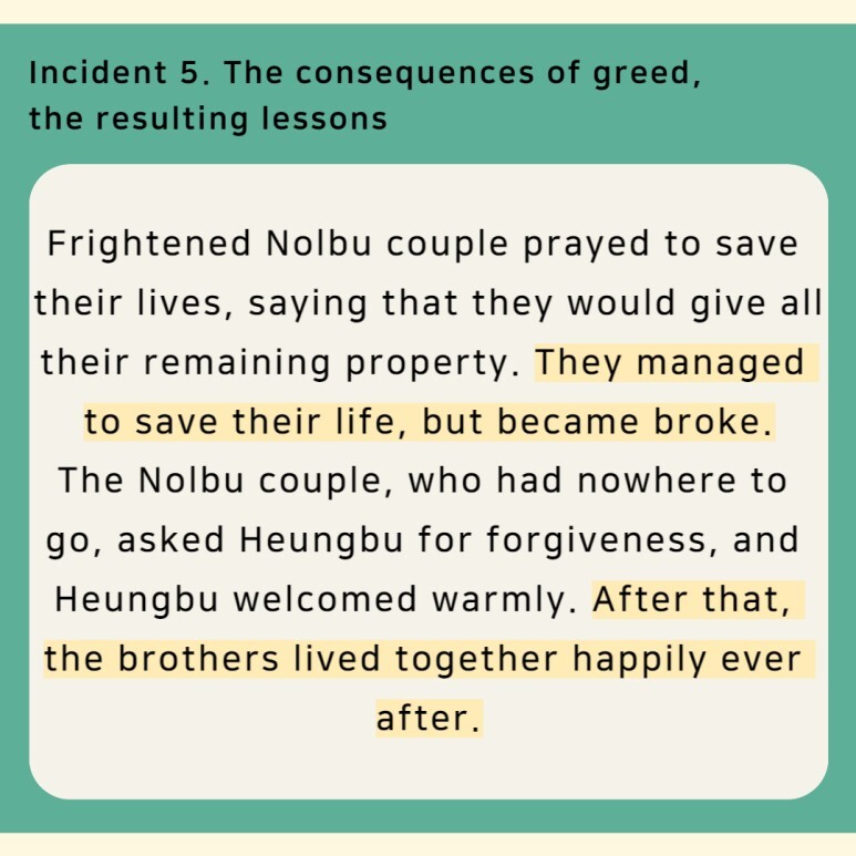The Nolbu couple, who had nowhere to go, asked Heungbu for forgiveness, and Heungbu welcomed warmly. After that, the brothers lived together happily ever after.