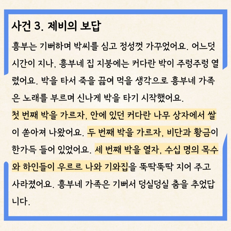 첫 번째 박을 가르자, 안에 있던 커다란 나무 상자에서 쌀이 쏟아져 나왔어요. 두 번째 박을 가르자, 비단과 황금이 한가득 들어 있었어요. 세 번째 박을 열자, 수십 명의 목수와 하인들이 우르르 나와 기와집을 뚝딱뚝딱 지어 주고 사라졌어요. 흥부네 가족은 기뻐서 덩실덩실 춤을 추었답니다.