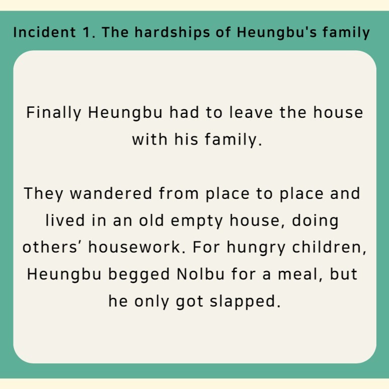 They wandered from place to place and lived in an old empty house, doing others’ housework. For hungry children, Heungbu begged Nolbu for a meal, but he only got slapped.