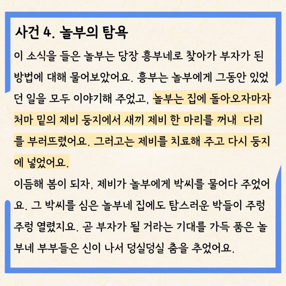 이 소식을 들은 놀부는 당장 흥부네로 찾아가 부자가 된 방법에 대해 물어보았어요. 흥부는 놀부에게 그동안 있었던 일을 모두 이야기해 주었고, 놀부는 집에 돌아오자마자 처마 밑의 제비 둥지에서 새끼 제비 한 마리를 꺼내 다리를 부러뜨렸어요. 그러고는 제비를 치료해 주고 다시 둥지에 넣었어요.