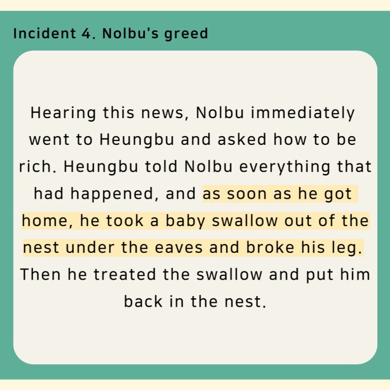 Hearing this news, Nolbu immediately went to Heungbu and asked how to be rich. Heungbu told Nolbu everything that had happened, and as soon as he got home, he took a baby swallow out of the nest under the eaves and broke his leg. Then he treated the swallow and put him back in the nest.