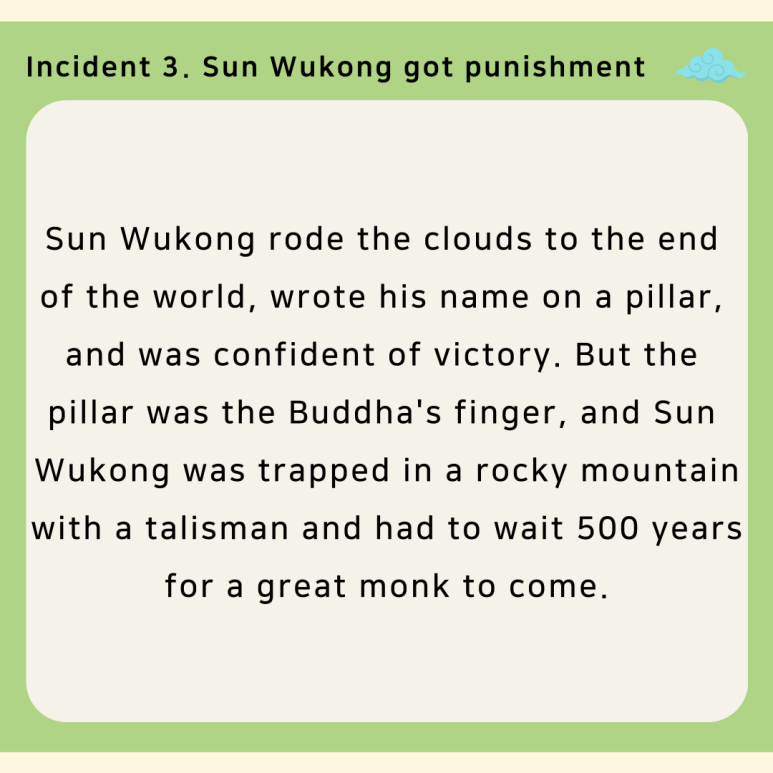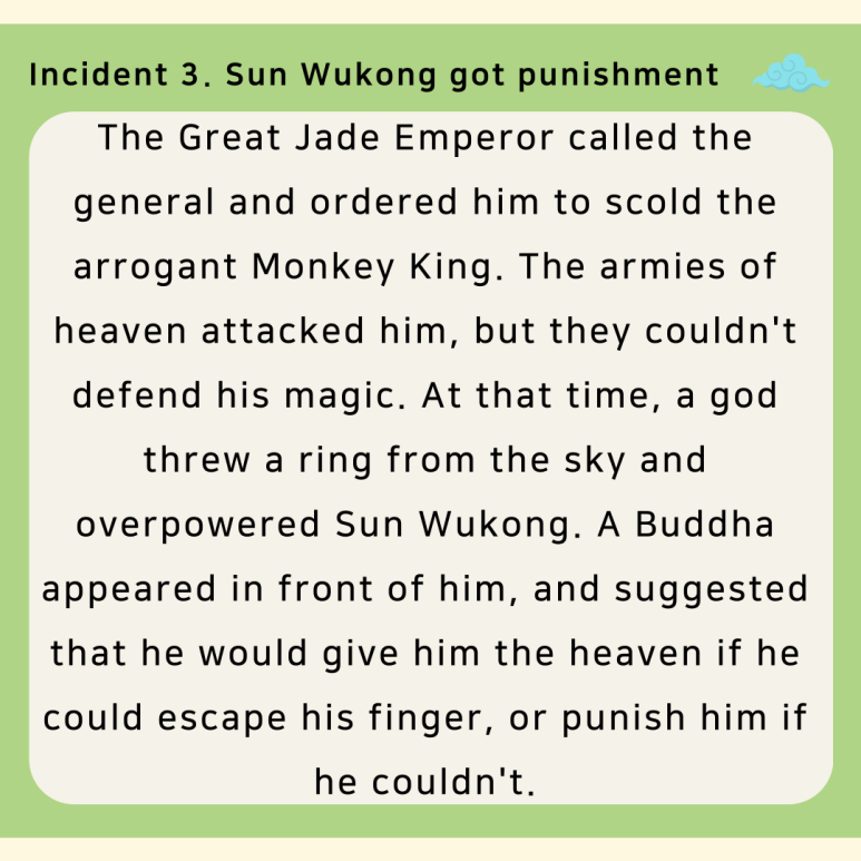 The Great Jade Emperor called the general and ordered him to scold the arrogant Monkey King. The armies of heaven attacked him, but they couldn't defend his magic. At that time, a god threw a ring from the sky and overpowered Sun Wukong. A Buddha appeared in front of him, and suggested that he would give him the heaven if he could escape his finger, or punish him if he couldn't. Sun Wukong rode the clouds to the end of the world, wrote his name on a pillar, and was confident of victory. But the pillar was the Buddha's finger, and Sun Wukong was trapped in a rocky mountain with a talisman and had to wait 500 years for a great monk to come.