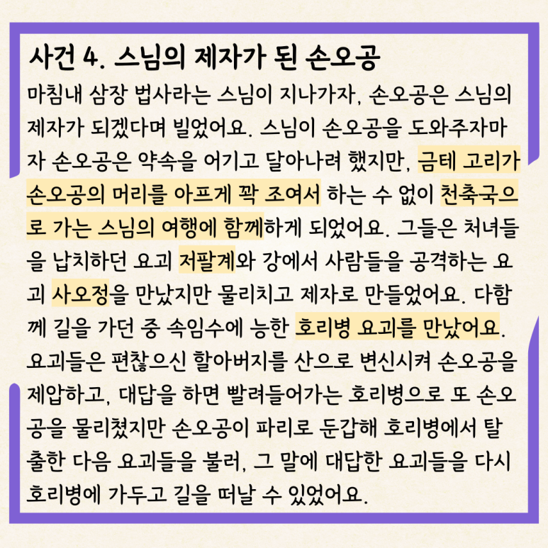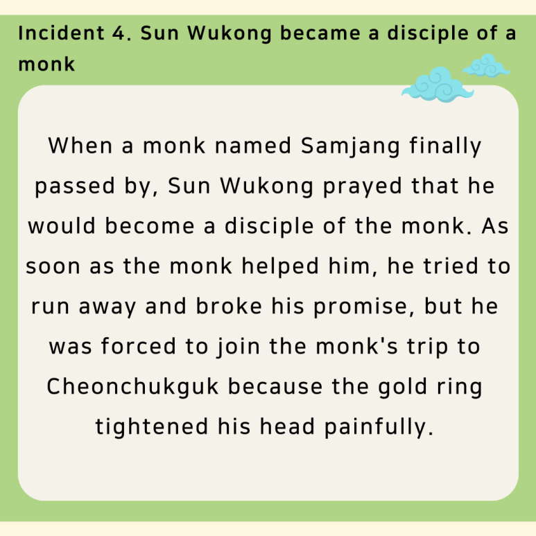 When a monk named Samjang finally passed by, Sun Wukong prayed that he would become a disciple of the monk. As soon as the monk helped him, he tried to run away and broke his promise, but he was forced to join the monk's trip to Cheonchukguk because the gold ring tightened his head painfully.
