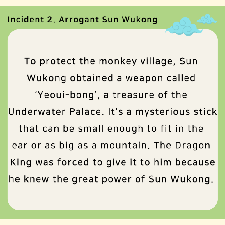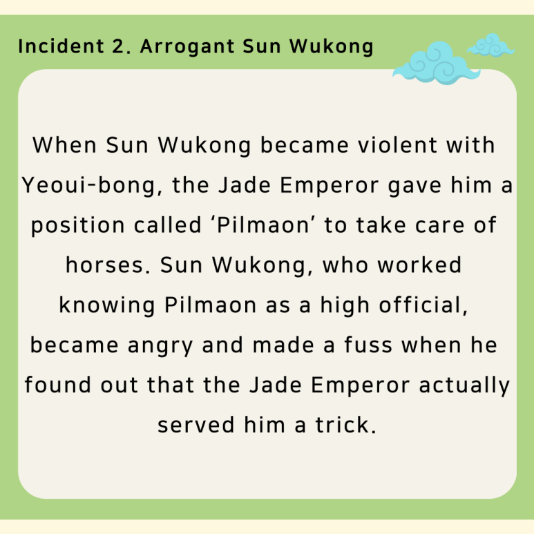 To protect the monkey village, Sun Wukong obtained a weapon called ‘Yeoui-bong’, a treasure of the Underwater Palace. It's a mysterious stick that can be small enough to fit in the ear or as big as a mountain. The Dragon King was forced to give it to him because he knew the great power of Sun Wukong. When Sun Wukong became violent with Yeoui-bong, the Jade Emperor gave him a position called ‘Pilmaon’ to take care of horses. Sun Wukong, who worked knowing Pilmaon as a high official, became angry and made a fuss when he found out that the Jade Emperor actually served him a trick.