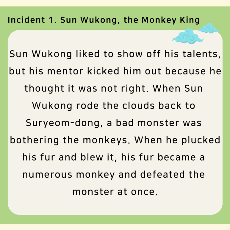 Sun Wukong liked to show off his talents, but his mentor kicked him out because he thought it was not right. When Sun Wukong rode the clouds back to Suryeom-dong, a bad monster was bothering the monkeys. When he plucked his fur and blew it, his fur became a numerous monkey and defeated the monster at once.