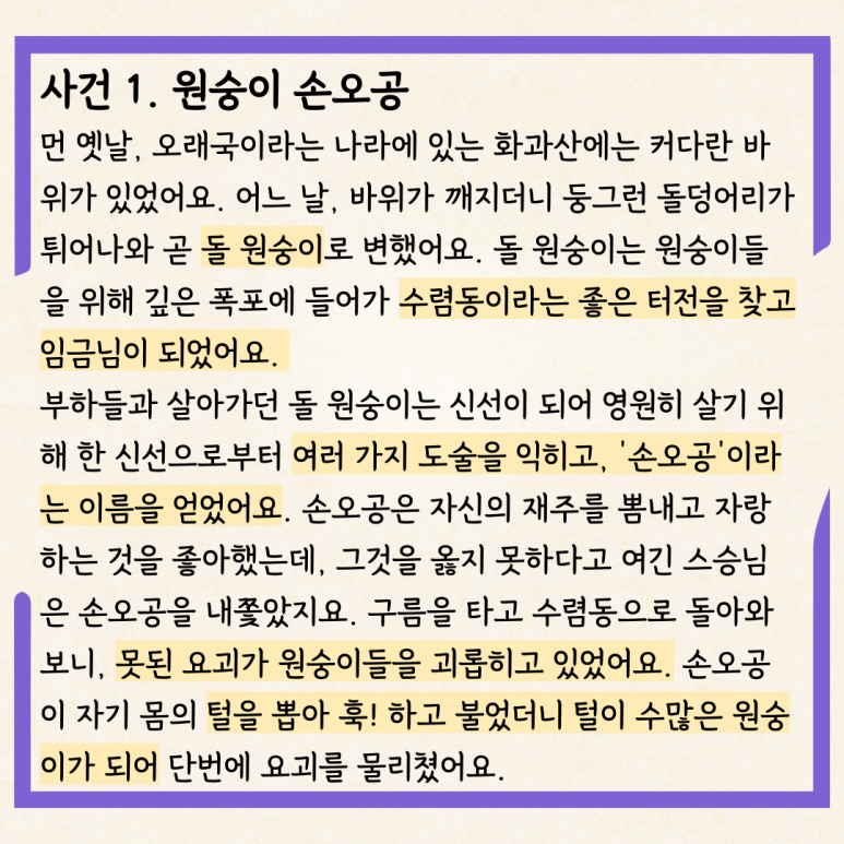 Once upon a time, there was a big rock in Hwagwasan Mountain in a country called ‘Oraeguk’. One day, a rock broke and a round stone popped out, and soon turned into a stone monkey. The stone monkey went into a deep waterfall for the monkeys, found a great base called Suryeom-dong, and became a king.
