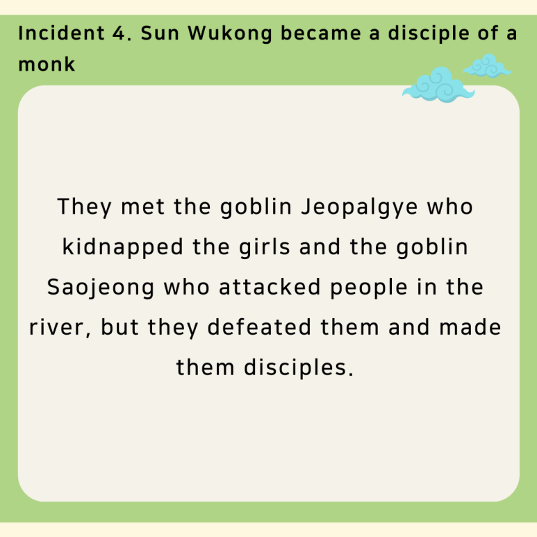 They met the goblin Jeopalgye who kidnapped the girls and the goblin Saojeong who attacked people in the river, but they defeated them and made them disciples.