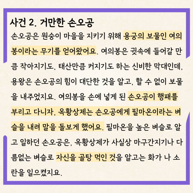 손오공은 원숭이 마을을 지키기 위해 용궁의 보물인 여의봉이라는 무기를 얻어왔어요. 여의봉은 귓속에 들어갈 만큼 작아지기도, 태산만큼 커지기도 하는 신비한 막대인데, 용왕은 손오공의 힘이 대단한 것을 알고, 할 수 없이 보물을 내주었지요. 여의봉을 손에 넣게 된 손오공이 행패를 부리고 다니자, 옥황상제는 손오공에게 필마온이라는 벼슬을 내려 말을 돌보게 했어요. 필마온을 높은 벼슬로 알고 일하던 손오공은, 옥황상제가 사실상 마구간지기나 다름없는 벼슬로 자신을 골탕 먹인 것을 알고는 화가 나 소란을 일으켰지요.