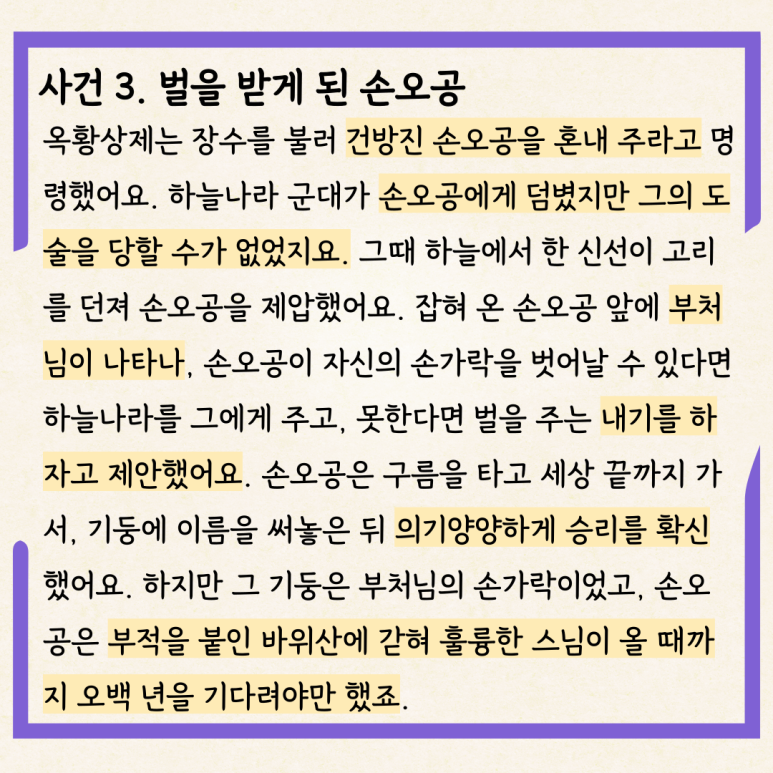 옥황상제는 장수를 불러 건방진 손오공을 혼내 주라고 명령했어요. 하늘나라 군대가 손오공에게 덤볐지만 그의 도술을 당할 수가 없었지요. 그때 하늘에서 한 신선이 고리를 던져 손오공을 제압했어요. 잡혀 온 손오공 앞에 부처님이 나타나, 손오공이 자신의 손가락을 벗어날 수 있다면 하늘나라를 그에게 주고, 못한다면 벌을 주는 내기를 하자고 제안했어요. 손오공은 구름을 타고 세상 끝까지 가서, 기둥에 이름을 써놓은 뒤 의기양양하게 승리를 확신했어요. 하지만 그 기둥은 부처님의 손가락이었고, 손오공은 부적을 붙인 바위산에 갇혀 훌륭한 스님이 올 때까지 오백 년을 기다려야만 했죠.