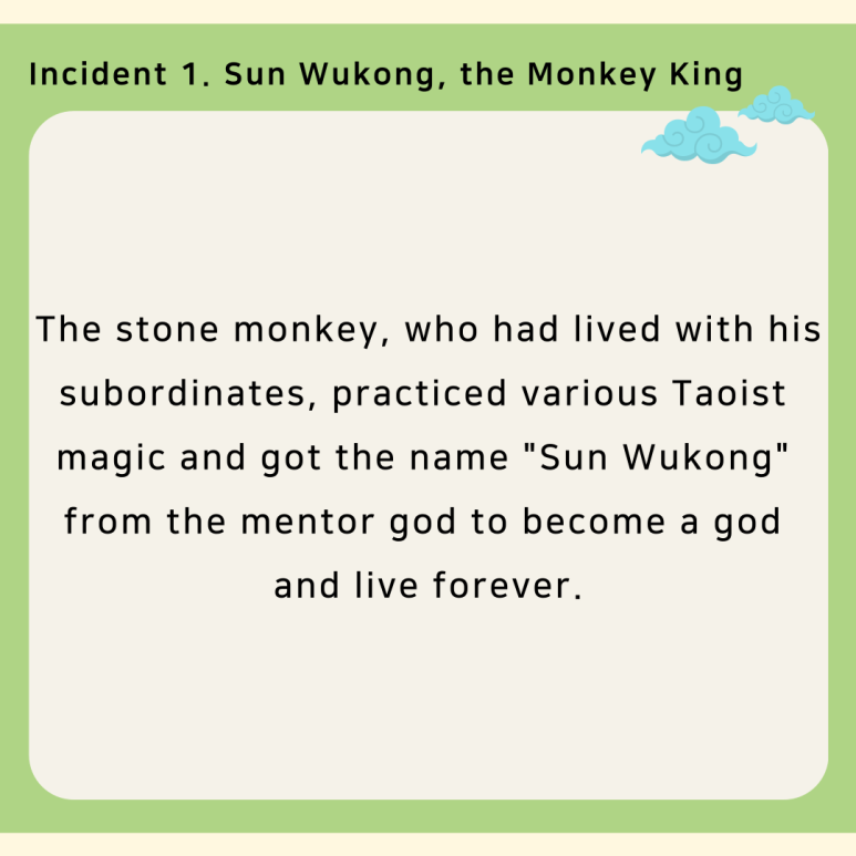 The stone monkey, who had lived with his subordinates, practiced various Taoist magic and got the name "Sun Wukong" from the mentor god to become a god and live forever.