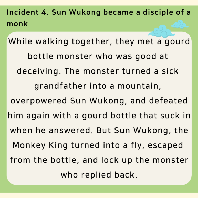While walking together, they met a gourd bottle monster who was good at deceiving. The monster turned a sick grandfather into a mountain, overpowered Sun Wukong, and defeated him again with a gourd bottle that suck in when he answered. But Sun Wukong, the Monkey King turned into a fly, escaped from the bottle, and lock up the monster who replied back.