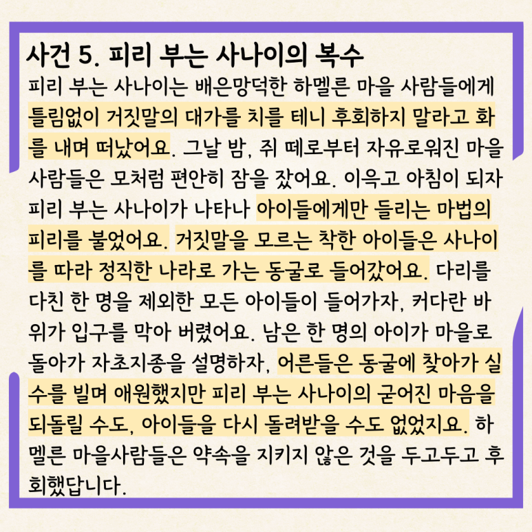 피리 부는 사나이는 배은망덕한 하멜른 마을 사람들에게 틀림없이 거짓말의 대가를 치를 테니 후회하지 말라고 화를 내며 떠났어요. 그날 밤, 쥐 떼로부터 자유로워진 마을 사람들은 모처럼 편안히 잠을 잤어요. 이윽고 아침이 되자 피리 부는 사나이가 나타나 아이들에게만 들리는 마법의 피리를 불었어요. 거짓말을 모르는 착한 아이들은 사나이를 따라 정직한 나라로 가는 동굴로 들어갔어요. 다리를 다친 한 명을 제외한 모든 아이들이 들어가자, 커다란 바위가 입구를 막아 버렸어요. 남은 한 명의 아이가 마을로 돌아가 자초지종을 설명하자, 어른들은 동굴에 찾아가 실수를 빌며 애원했지만 피리 부는 사나이의 굳어진 마음을 되돌릴 수도, 아이들을 다시 돌려받을 수도 없었지요. 하멜른 마을사람들은 약속을 지키지 않은 것을 두고두고 후회했답니다.