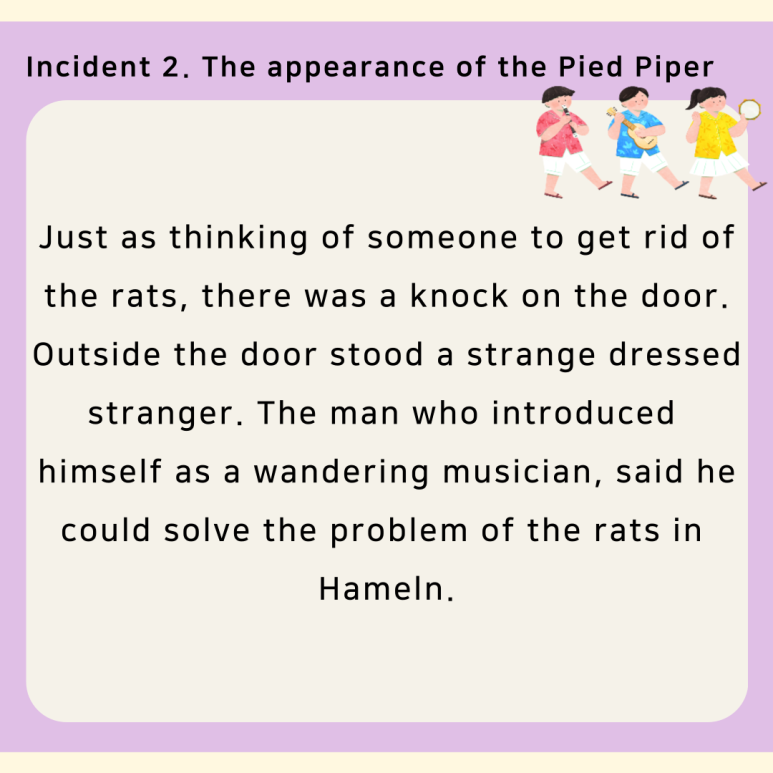 Just as thinking of someone to get rid of the rats, there was a knock on the door. Outside the door stood a strange dressed stranger. The man who introduced himself as a wandering musician, said he could solve the problem of the rats in Hameln.