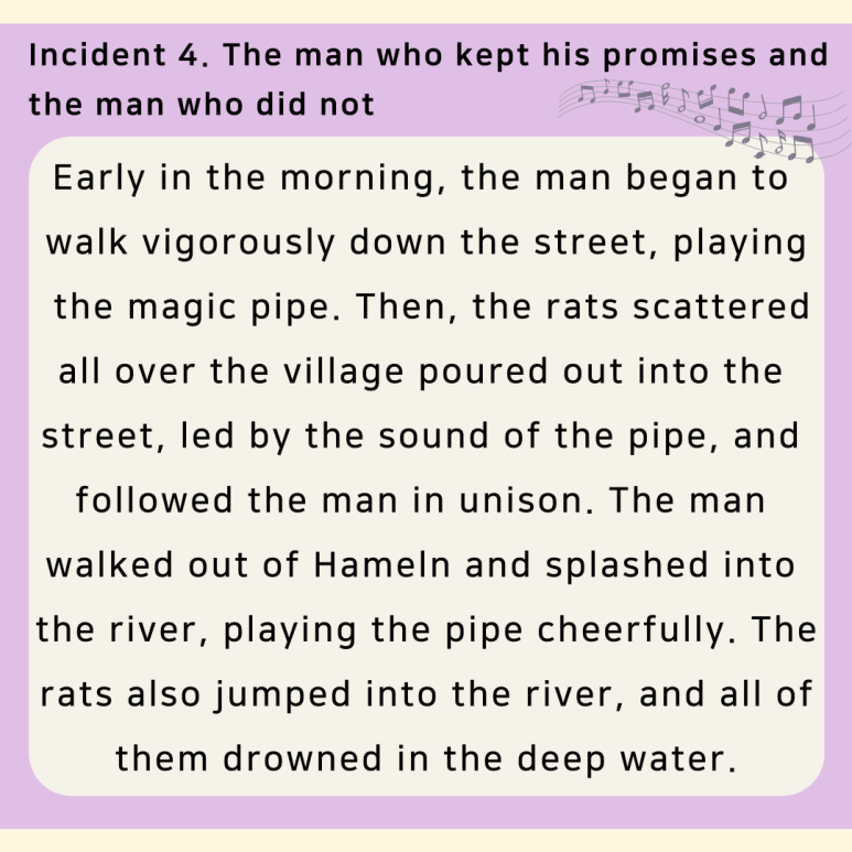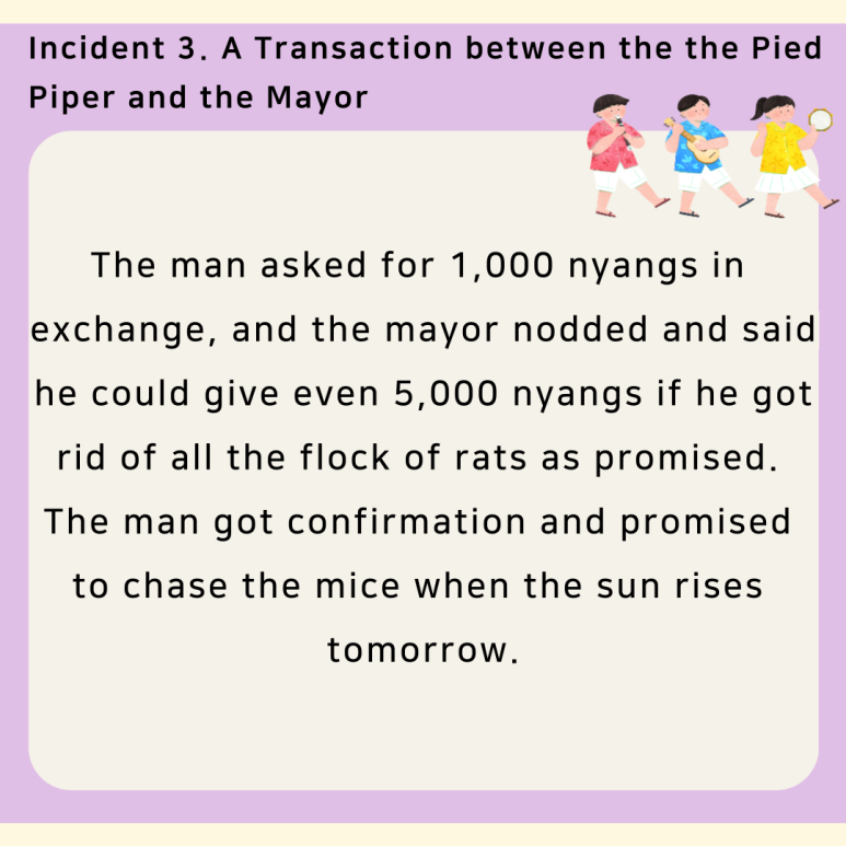 The piped piper appeared in front of the villagers who were happy that the rats disappeared and asked for 5,000 nyangs, but people resolutely refused. The man asked for 1,000 nyangs to keep their promise, but the mayor handed him with only 50 nyangs, saying, "The rats are already dead, so our business is over, and we have no food and money.“