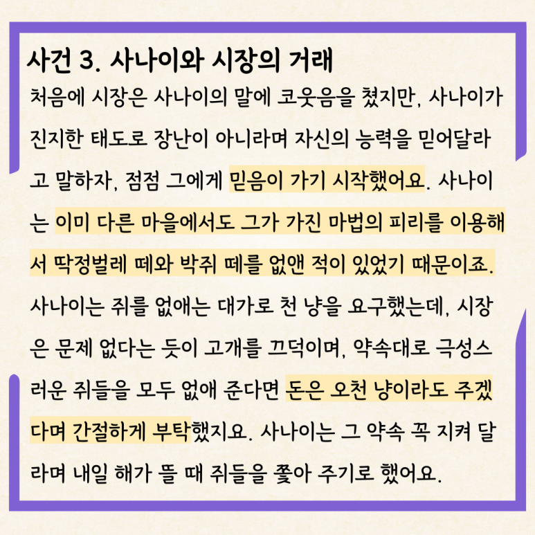 사나이는 쥐를 없애는 대가로 천 냥을 요구했는데, 시장은 문제 없다는 듯이 고개를 끄덕이며, 약속대로 극성스러운 쥐들을 모두 없애 준다면 돈은 오천 냥이라도 주겠다며 간절하게 부탁했지요. 사나이는 그 약속 꼭 지켜 달라며 내일 해가 뜰 때 쥐들을 쫓아 주기로 했어요.
