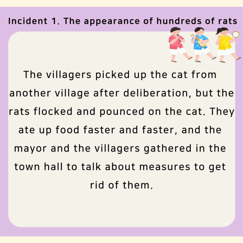 The villagers picked up the cat from another village after deliberation, but the rats flocked and pounced on the cat. They ate up food faster and faster, and the mayor and the villagers gathered in the town hall to talk about measures to get rid of them.