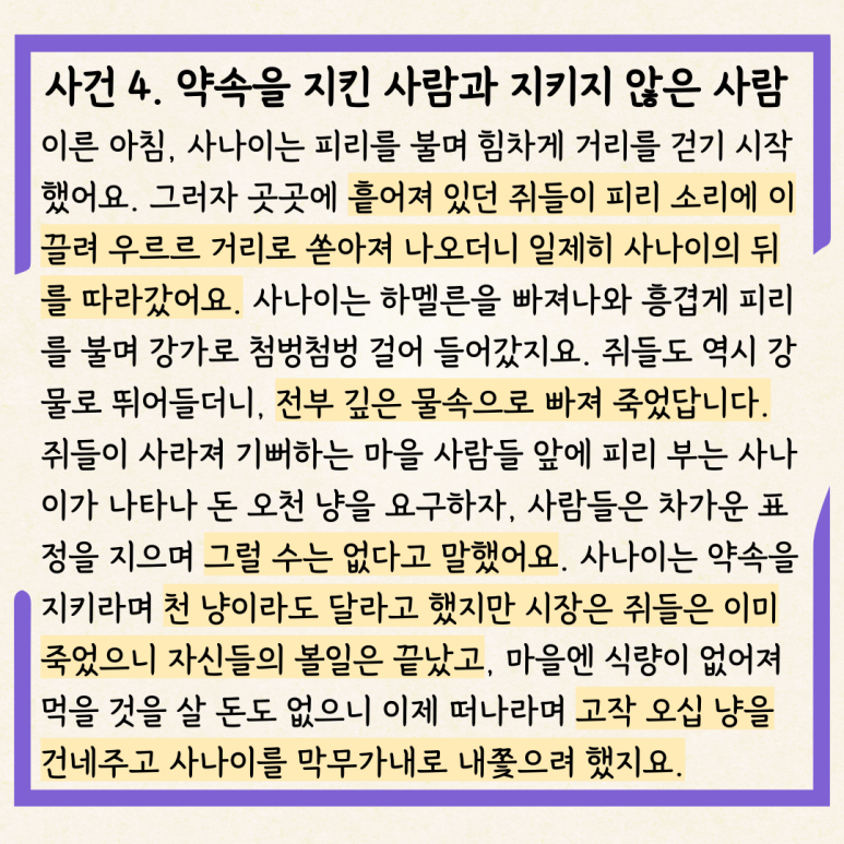 쥐들이 사라져 기뻐하는 마을 사람들 앞에 피리 부는 사나이가 나타나 돈 오천 냥을 요구하자, 사람들은 차가운 표정을 지으며 그럴 수는 없다고 말했어요. 사나이는 약속을 지키라며 천 냥이라도 달라고 했지만 시장은 쥐들은 이미 죽었으니 자신들의 볼일은 끝났고, 마을엔 식량이 없어져 먹을 것을 살 돈도 없으니 이제 떠나라며 고작 오십 냥을 건네주고 사나이를 막무가내로 내쫓으려 했지요.