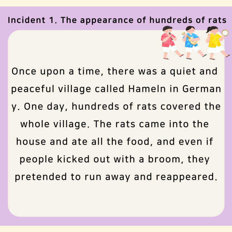 Once upon a time, there was a quiet and peaceful village called Hameln in Germany. One day, hundreds of rats covered the whole village. The rats came into the house and ate all the food, and even if people kicked out with a broom, they pretended to run away and reappeared.