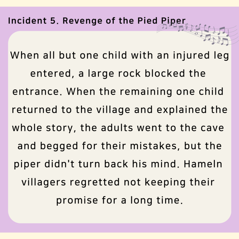 When all but one child with an injured leg entered, a large rock blocked the entrance. When the remaining one child returned to the village and explained the whole story, the adults went to the cave and begged for their mistakes, but the piper didn't turn back his mind. Hameln villagers regretted not keeping their promise for a long time.