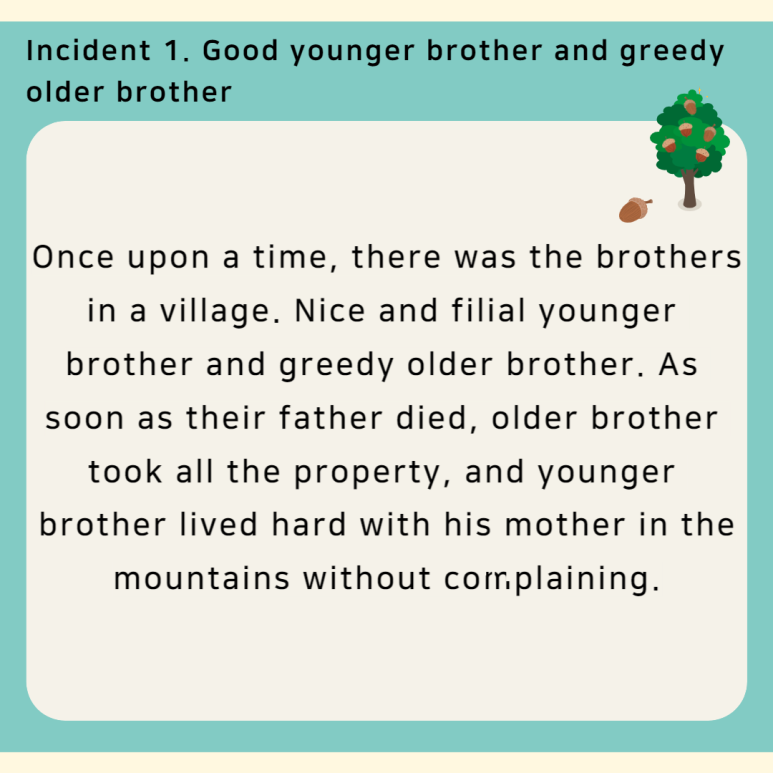 Once upon a time, there was the brothers in a village. Nice and filial younger brother and greedy older brother. As soon as their father died, older brother took all the property, and younger brother lived hard with his mother in the mountains without complaining. Before the cold winter, the younger brother was cutting down the trees and there was a rolling sound. A nut rolled over. And then another one, another. He put them in his pocket, deciding to give one to his mother, one to his brother, and one to himself.