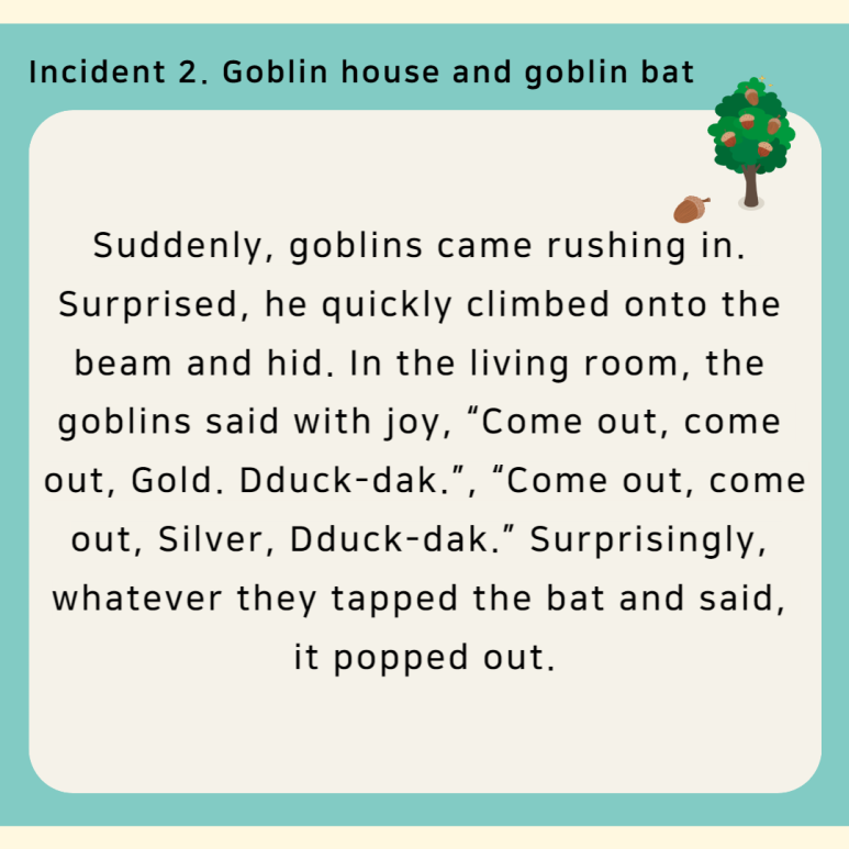 Suddenly, goblins came rushing in. Surprised, he quickly climbed onto the beam and hid. In the living room, the goblins said with joy, “Come out, come out, Gold. Dduck-dak.”, “Come out, come out, Silver, Dduck-dak.” Surprisingly, whatever they tapped the bat and said, it popped out.