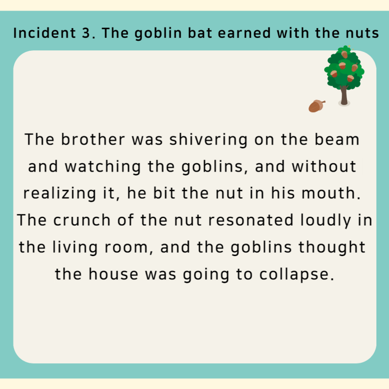 The brother was shivering on the beam and watching the goblins, and without realizing it, he bit the nut in his mouth. The crunch of the nut resonated loudly in the living room, and the goblins thought the house was going to collapse. "The beam collapses. Let's run away," the goblins shouted, throwing away everything they had and scrambling away. The brother left alone and came down the mountain with gold and silver treasures and bats. He became rich in making houses like a palace and delicious food with bats.