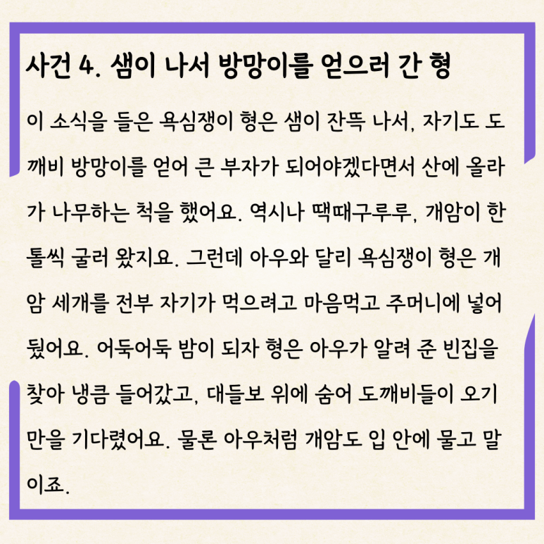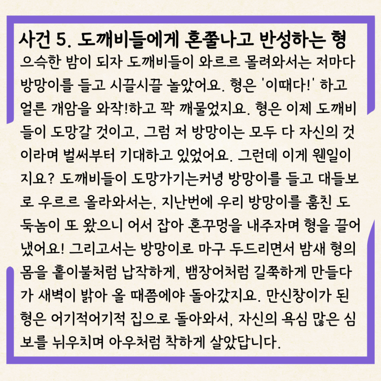 으슥한 밤이 되자 도깨비들이 와르르 몰려와서는 저마다 방망이를 들고 시끌시끌 놀았어요. 형은 ‘이때다!’ 하고 얼른 개암을 와작!하고 꽉 깨물었지요. 형은 이제 도깨비들이 도망갈 것이고, 그럼 저 방망이는 모두 다 자신의 것이라며 벌써부터 기대하고 있었어요. 그런데 이게 웬일이지요? 도깨비들이 도망가기는커녕 방망이를 들고 대들보로 우르르 올라와서는, 지난번에 우리 방망이를 훔친 도둑놈이 또 왔으니 어서 잡아 혼꾸멍을 내주자며 형을 끌어냈어요! 그리고서는 방망이로 마구 두드리면서 밤새 형의 몸을 홑이불처럼 납작하게, 뱀장어처럼 길쭉하게 만들다가 새벽이 밝아 올 때쯤에야 돌아갔지요. 만신창이가 된 형은 어기적어기적 집으로 돌아와서, 자신의 욕심 많은 심보를 뉘우치며 아우처럼 착하게 살았답니다.